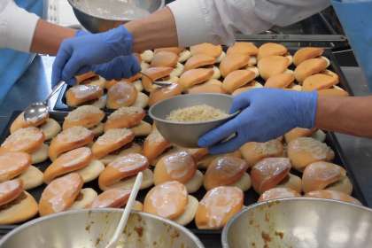 今日の主食は焼きカレーパンです。カレーパンは油で揚げて作られる料理ですが、給食室ではオーブンで焼いて作ります。パンにパン粉をまぶし、サクサクした食感を出しました。