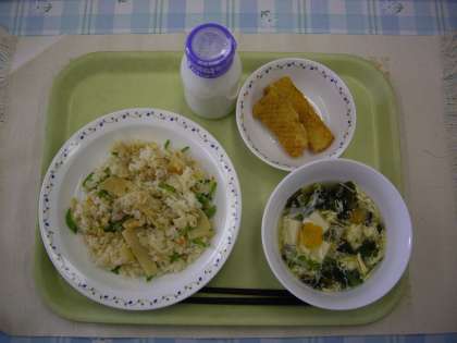 今日の給食のメニューは「たけのこご飯、いかのカリン揚げ、かきたま汁、牛乳」です。春らしい彩りの給食です。