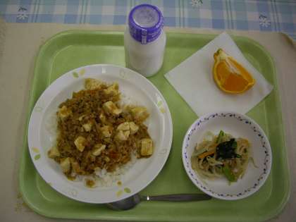 今日のメニューは「マーボー丼、塩ナムル、でこぽん、牛乳」です。給食の時間には、栄養士が、毎日「給食だより いただきます」を発行しています。