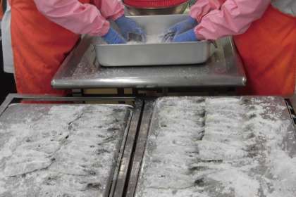 今日の主菜は、いわしの揚げびたしです。いわしは栄養価がとても高い魚です。いわしに粉をつけて油で揚げた後、たれをつけて味を染み込ませています。