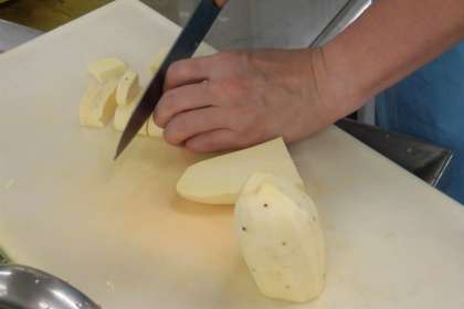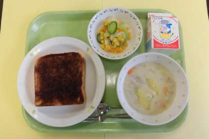 今日の主菜は、秋が旬のさつまいもが入ったシチューです。ようやく秋を感じられる季節になりました。この日は、熊本県産の「紅はるか」という品種のさつまいもを使用し、さつまいもの甘みを感じることができます。