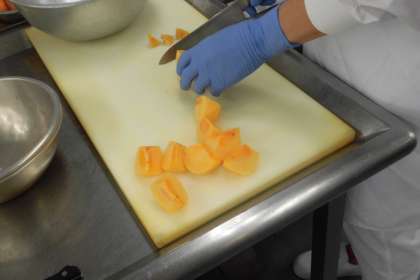 今日の果物は、柿です。給食で柿が出るのは珍しいですが、柿の栄養価は高く、健康に役立つ食べ物として知られています。特に、風邪予防に効果的なビタミンAやビタミンCが多く含まれています。
