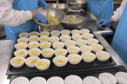 今日は秋が旬のさつまいもを使った蒸しパンを作りました。生地の中にさつまいもを混ぜ合わせ、さらに上からもさつまいもを乗せているので、さつまいもの味をしっかりと感じられます。オーブンを開けると、さつまいもの甘い香りが給食室に漂いました。