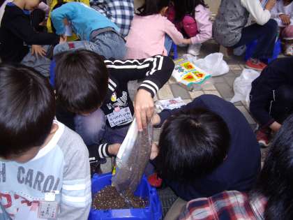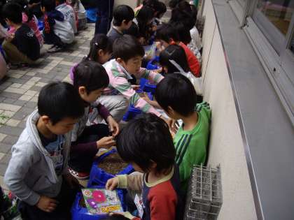 1年生がアサガオの種をまきました。先生役は2年生です。2年生は土の入れ方や種の蒔き方を、とても丁寧に教えていました。1年生は嬉しそうでした。