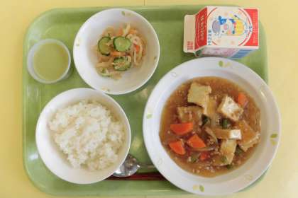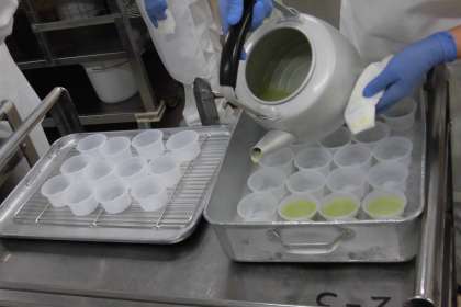 今日のご飯は、有機米を使っています。先週と同じ千葉県産の粒すけです。ゼリーはリクエストが多い抹茶ミルクゼリーです。苦味を抑えて作っているので、おいしく食べられます。