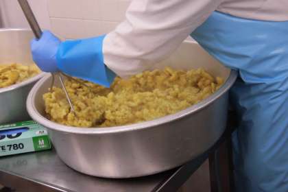 今日のデザートは、スイートポテトです。スイートポテトは日本で誕生したお菓子です。「シルクスイート」という甘くてなめらかな食感のさつまいもを使って作りました。