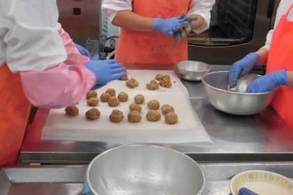 今日の給食は、ごま入りサーターアンダギーです。サーターアンダギーは、沖縄県の揚げ菓子です。「サーター」は砂糖、「アンダギー」は油で揚げたものという意味があります。給食室では、ごまが入った黒糖味のサーターアンダギーを作りました。