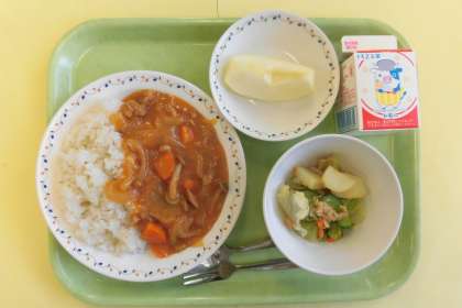今日の給食は、きのこのハッシュドポークライスです。マッシュルーム・しめじ・エリンギの3種類のきのこを使いました。きのこ類は栄養価も高く、うま味もたっぷりです。今日のりんごは、「王林」という品種で、香りが良く上品な甘さのりんごです。