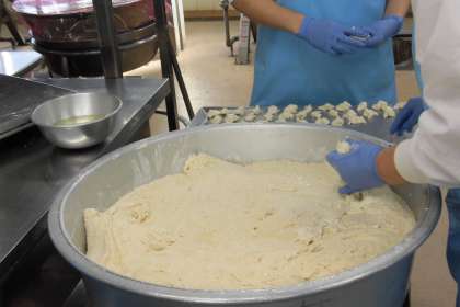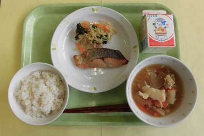 1月24日〜30日は、学校給食について考える「全国学校給食週間」です。今日は昔の給食をイメージした献立です。学校給食の始まりと言われている明治22年の献立は「おにぎり・鮭・漬物」でした。すいとんは、昭和17年頃に食べられていた給食の一つです。写真は、すいとんを給食室で作っている様子です。