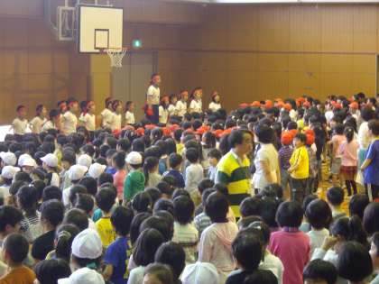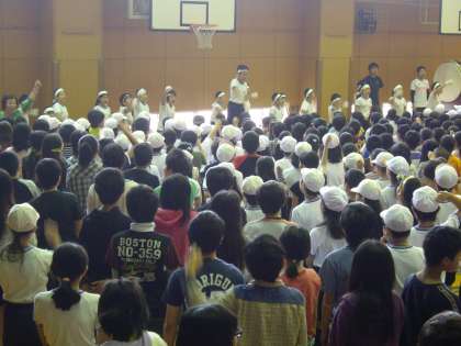 音楽朝会では、「運動会の歌」を練習しました。赤・白の応援団長が前に立ってリードをします。応援団員のそろった動きに合わせるように、1年から6年までの大きな声が体育館に溢れました。「運動会に歌」は掛け合いになっているので、相手より大きな声で歌おうと子どもたちは張り切ります。朝からみんなの気持ちが一つになりました。