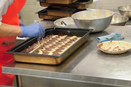 2月14日はバレンタインデーのため、ココア味のケーキを作りました。ココア生地の上に、プレーン生地をかけ、マーブル模様を描いています。