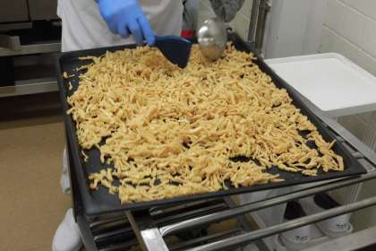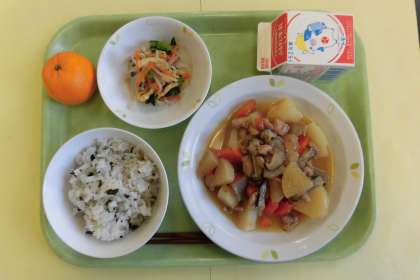 今日の副菜は、カリカリ油揚げと野菜のおひたしです。油揚げは、大豆から作られる食べ物の一つです。今日の給食では、油揚げをオーブンで焼いてカリカリ食感に仕上げました。