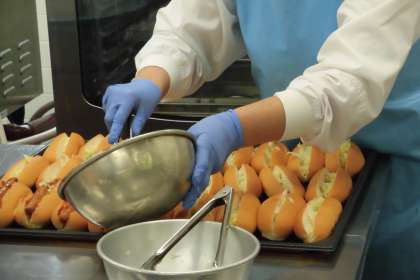 今日の主食は、ホットドッグです。アメリカ発祥の料理です。給食室では、パンに切れ目を入れ、キャベツとソーセージを挟んでオーブンで焼きました。