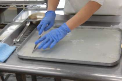 今日は給食室でフルーツみつ豆を作りました。赤えんどう豆、寒天、みかん缶、桃缶、パイン缶に黒みつをかけました。寒天と黒みつは手作りです。写真は寒天を切り分けているところです。