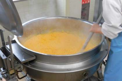 今日は、3月3日の桃の節句の献立です。給食室では、ちらしずしを作りました。写真は、炒り卵を作っている様子です。