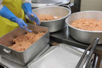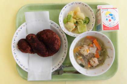 今日の主食は、揚げパンです。6年生のリクエストメニューです。他の学年からも多くのリクエストがありました。副菜は、揚げパンと相性が良い白菜と肉団子のスープです。肉団子は手作りで、肉を練って団子状に丸める作業を給食室で行っています。