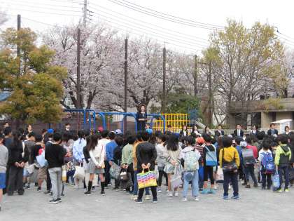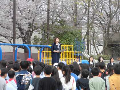 雨の心配がありましたが、花曇りで、満開の桜に彩られた第一日目です。転入職員の紹介、担任発表に続いて、始業式を行いました。みんな、しっかりとこちらに目を向けて話を聞いていました。