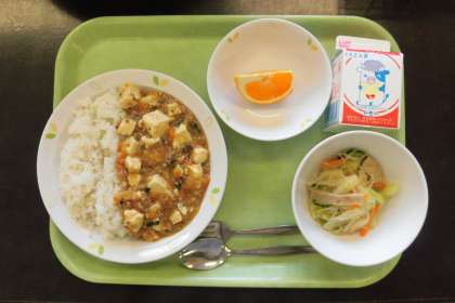今日から1学期の給食が始まりました。今日の給食は、豆腐をたくさん使ったマーボー豆腐ライスです。給食は、子供たちの心身の健康のために栄養バランスを考えて作っています。おいしく食べて楽しい給食時間にしましょう。