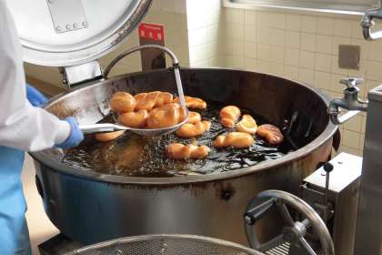 今日の主食は、人気メニューの揚げパンです。パンをからっと油で揚げ、砂糖をまぶしました。砂糖に少しを塩を入れることで、甘さが引き立ちます。
