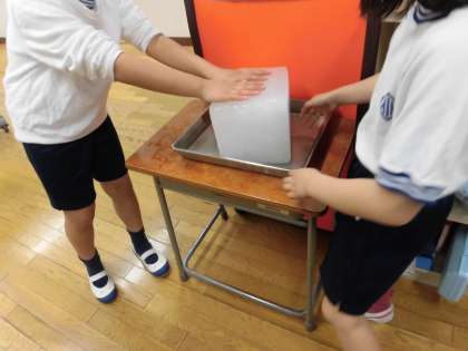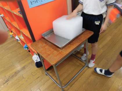 今日はうれしい驚きがありました。3年生の先生が、南極の氷を子どもたちに見せてくださいました。本物の南極の氷です。見るだけでなくさわってもいいですよ、ということで、3年生だけでなく、多くの子どもたちがその氷を「感じる」ことができたようです。