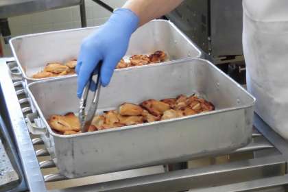 今日の主菜は鶏の照り焼きです。甘辛いたれに鶏肉を漬けこみ、オーブンで焼きました。焼きあがった鶏肉は、クラスの人数分ずつ数えて食缶に入れます。