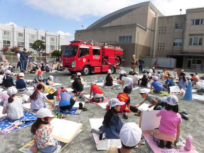 校庭で、2年生のはたらく消防写生会がありました。成城消防署から、消防士さんと消防車が2台、来てくださいました。子どもたちは車両を囲んで、思い思いに描いています。
