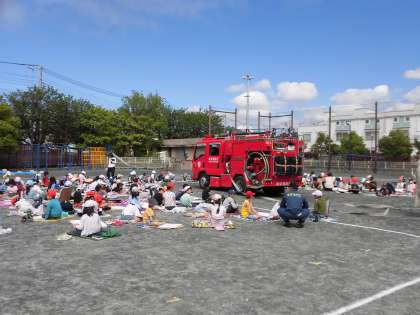 心配された天気が回復して、実施でき本当によかったですね。子どもたちに大人気の消防車と消防士さんでした。