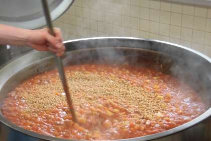 今日の主菜は、ポークビーンズです。ポークビーンズはアメリカの家庭料理の一つです。豚肉と大豆をトマト味で煮込んで作りました。