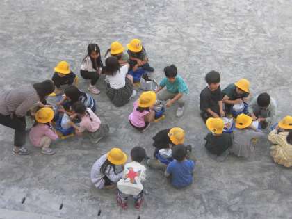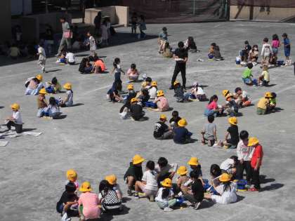 校庭で、2年生と1年生が一緒に活動しています。生活科で「アサガオのたねをうえよう」という学習です。2年生は鉢に土を入れたり、たねを埋める穴をあけたりすることを、1年生に教えています。事前に、どんなふうに教えたらいいか、教室で練習してきたようです。子ども同士、教えたり教えられたりするなかで、おもいやりの心も育まれています。