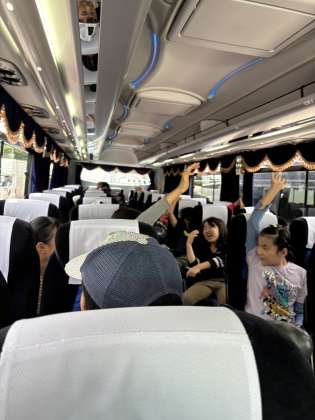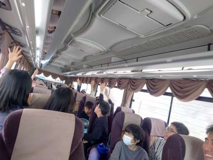 高速道路を順調に進んでいる5年生です。最初のトイレ休憩のあと、それぞれのバスではバスレクが始まりました。盛り上がっています。