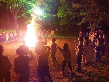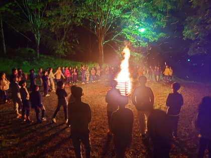 川場村に夜が訪れ、キャンプファイヤーが始まりました。火の神、火の子が点火したファイヤーの炎が勢いよく燃え上がります。みんなの気持ちを一つにする炎、その明かりの中に笑顔が見えます。