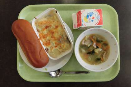 今日の主食は、ポテトグラタンです。グラタンは、フランス生まれの料理で、フランス語で「おこげ」という意味があります。給食では、一人分ずつカップに分け、おいしそうな焼き目がつくようにオーブンで焼きました。