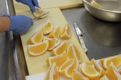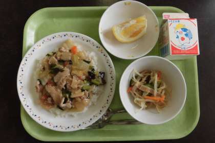 今日の果物は河内晩柑です。黄色くて丸いので、グレープフルーツに似ていますが、ジューシーさわやかな風味が特徴です。中華丼に入っている小松菜は東京都江戸川区産のものを使用しています。