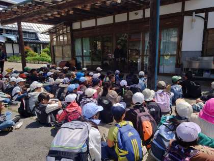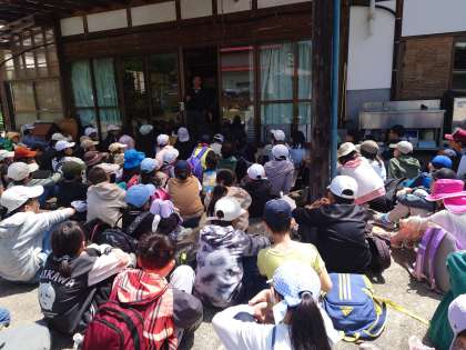 農家の方のお話しを聞きました。この方がどうしてりんご園をやることになったのか、みんな真剣に話を聞いています。リンゴは1年に何回採れるのか、年中店にあるのはどうしてか、考えました。