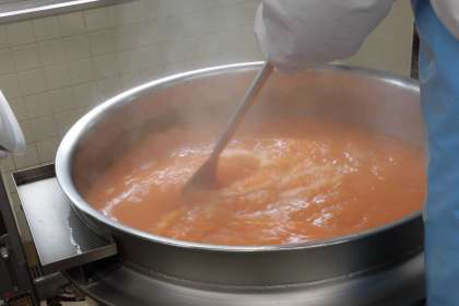 今日のデザートは、濃いオレンジ色がきれいなキャロットゼリーです。写真は、にんじんとオレンジジュースを合わせてゼリー液を作っている様子です。サラダには、素揚げしたじゃがいもが入っているので子供達に人気でした。
