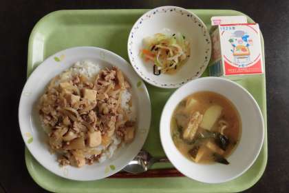 今日の主食は、高野豆腐入り豚丼です。豚肉には、疲労回復に良いビタミンB1が多く含まれています。気温の変化が大きく、体調を崩しやすいので、バランスよく食べて、しっかり寝ることを心がけましょう。