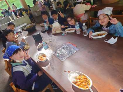 カレーは同じ材料を使っているのに、それぞれのグループで個性が出ました。でも、みんなで満足して、おいしくいただきました。普段よりたくさん食べているようです。