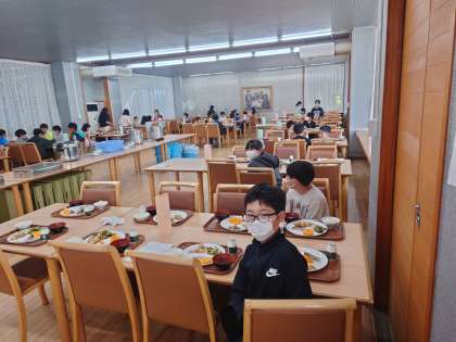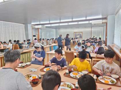 5分前行動で、全員が集まって、朝食が始まりました。みんなで食べる食事はいつもより、食が進むようです。
