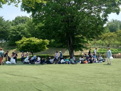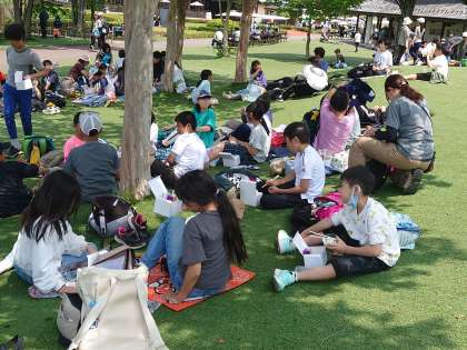 予定より30分ほど遅れました。田園プラザの芝生のところで、お弁当を食べています。このあとに、学校に向けて帰ります。