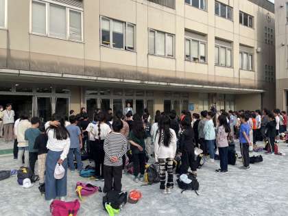 予定より少し遅くなりましたが、無事、学校に帰ってきました。帰校式では、子どもたち同士で声をかけ、式を初めから最後まで運営しました。