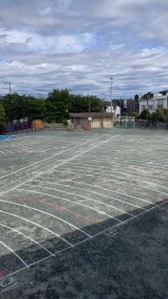 体力テスト期間、先生方は子どもたちが登校してくる前と、下校した後に、その準備をしています。この校庭に引かれた目盛りも、その一つです。