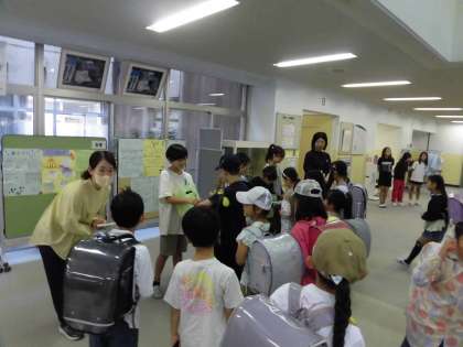 その隣では、5年生の有志が「おはようございます」と声を上げています。あいさつ当番ではないけれど、自主的な取り組みだということです。そしてもちろん、外では雨の中、軒の下で当番の子どもたちが声を上げています。
