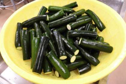 今日の副菜は、夏野菜のポトフです。ズッキーニやコーン、いんげんを加え、夏らしく仕上げました。ズッキーニは、きゅうりに似た野菜ですが、かぼちゃの仲間だそうです。