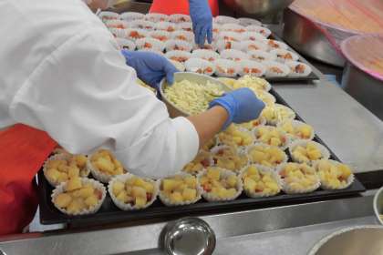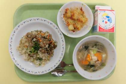 今日の主食は、クファジューシーです。沖縄県の郷土料理の一つで、豚肉が入った炊き込みごはんです。豚肉と昆布、椎茸のうま味が染み込んでいます。写真は、鮭の和風チーズポテトを作っている様子です。