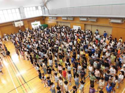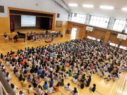 音楽朝会で「大きな歌」を歌いました。体育館いっぱいに並んだ子どもたちですが、前方は1,2,3年、後方は4,5,6年です。歌の先行は高学年が担当し、そのあとを追って低学年が歌いました。高学年の高い声が美しく響いていました。音楽委員会の演奏に合わせてみんなで声を合わせて、楽しい時間を過ごしました。