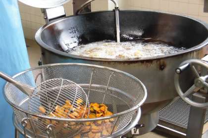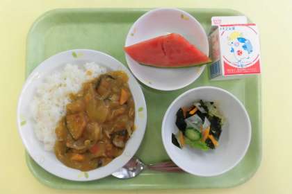 1学期最後の給食は、夏野菜のカレーライスです!夏野菜は、彩りが良く、ビタミン類など栄養を豊富に含んでいます。今日の給食では、なす・かぼちゃ・ピーマンを加えました。一度素揚げしているので、煮崩れずにおいしく仕上がります。