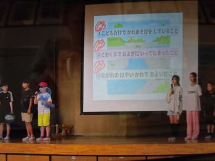 集会委員会とは月に1回のペースで児童集会を行う委員会のことです。夏休みは川遊びや花火、お出かけなど、楽しいことがたくさんある半面、危険も多いということを、劇やクイズで発表してくれました。
