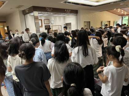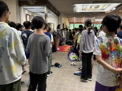 あっという間に3日目の朝となりました。直前に雨が降ってきたので、清晃苑のロビーで閉園式を行いました。狭いところに180人くらいが集まりました。予定通りでなくても、協力して静かに会が進行できました。代表児童からは、宿舎やその他のお世話になった方への感謝の気持ちが伝えられました。