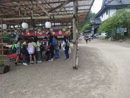 班ごとにスタンプラリーをしながら回っています。ときどき、お侍さんが通るので声をかけて一緒に写真を撮ってもらっています。江戸の町並みと江戸時代風の人たち、思い出になりそうですね。