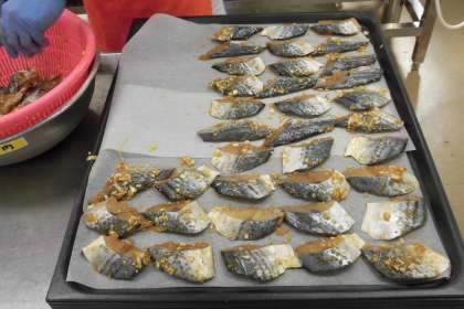 今日の主菜は、魚のねぎみそ焼きです。ねぎとみそを合わせたたれで下味をつけ、オーブンで焼きました。今日の魚は、さわらを使いました。